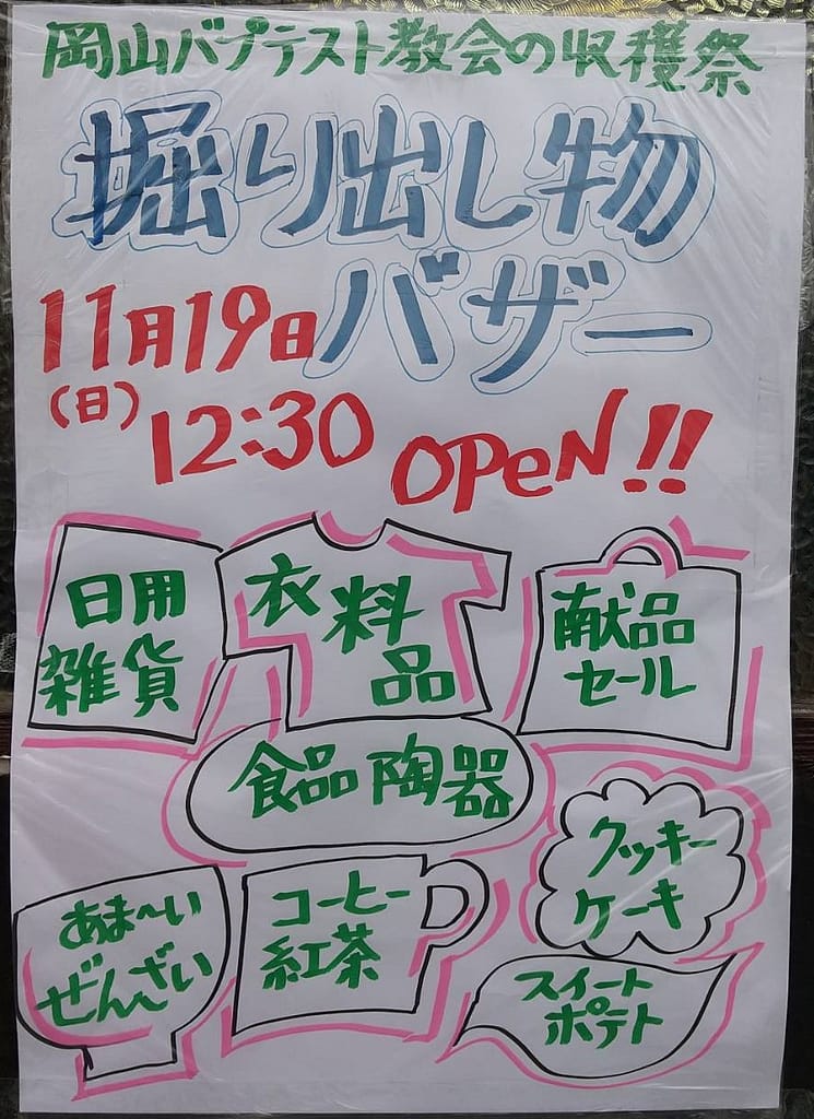 11月19日に岡山バプテスト教会の収穫祭 掘り出し物バザー開催します!皆さんお誘い合わせの上、お越しください!
